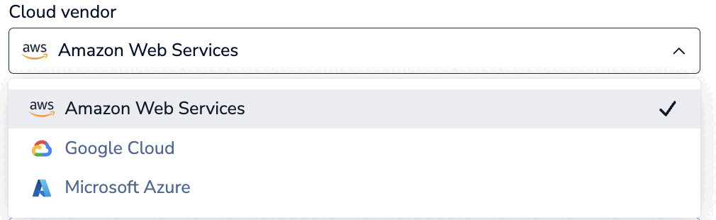 Choose a Cloud vendor for your database from the list. You can choose between Amazon Web Services (AWS), Google Cloud, and Microsoft Azure for the Cloud Vendor.