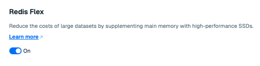 Redis Flex databases have a tiered solid state drive (SSD) and RAM architecture. Using SSDs instead of RAM significantly reduces infrastructure costs, which means developers can build applications that require large datasets using the same Redis API.