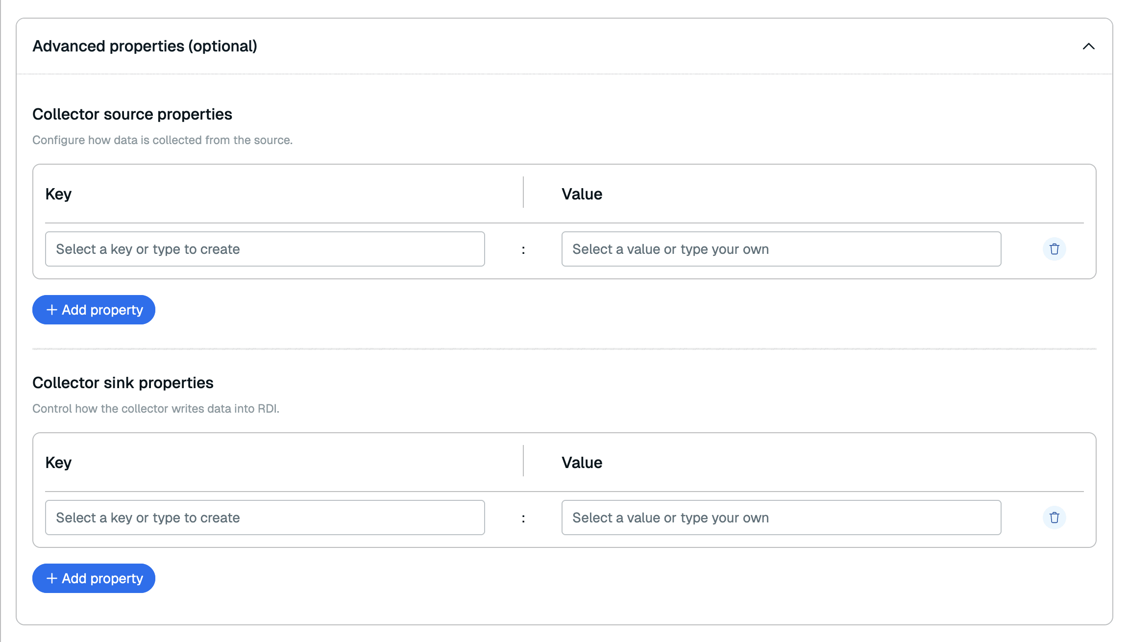 In the Advanced properties section, you can add any processor properties to control how the data is processed. See the RDI configuration file reference for all available processor properties.