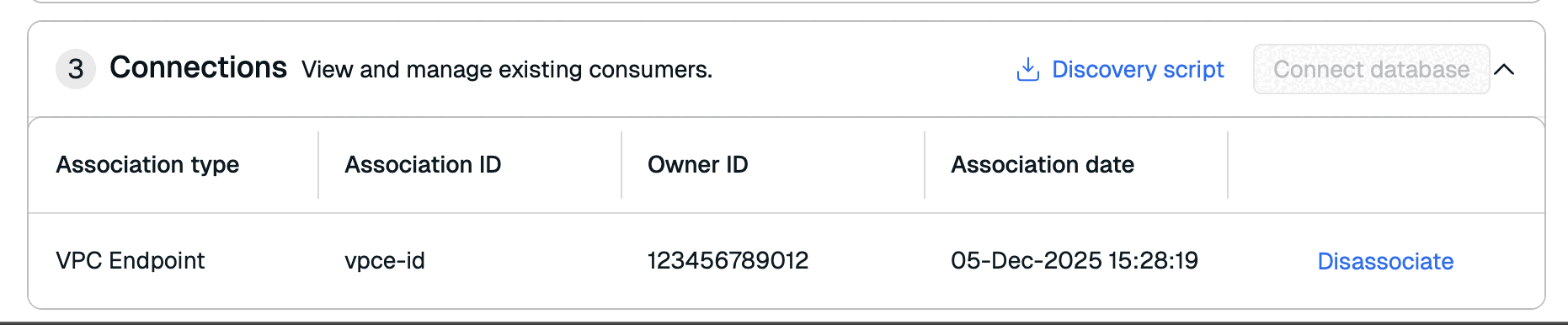 You can connect to your database by using the database private-dns-entry and port from your consumer VPC. You can also connect to the metrics endpoint with services like Prometheus and Grafana by using the metrics private-dns-entry and port.