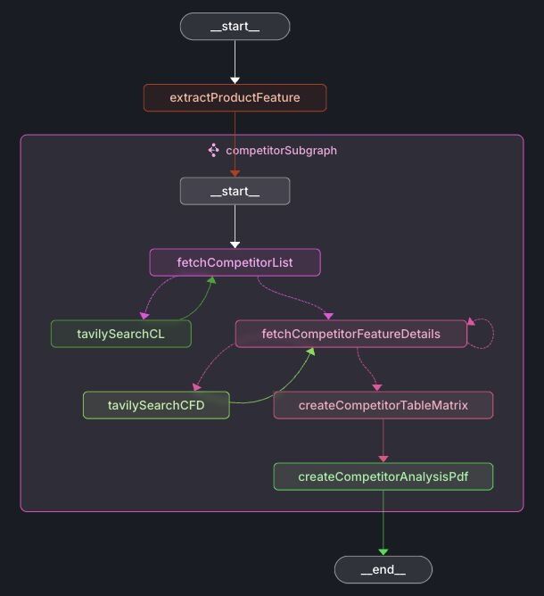 - fetchCompetitorList: Uses the Tavily web search to identify competitors associated with the given product feature.