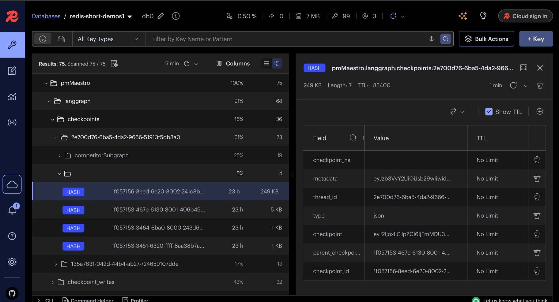 Below is a screenshot illustrating checkpointer data stored in Redis Insight: