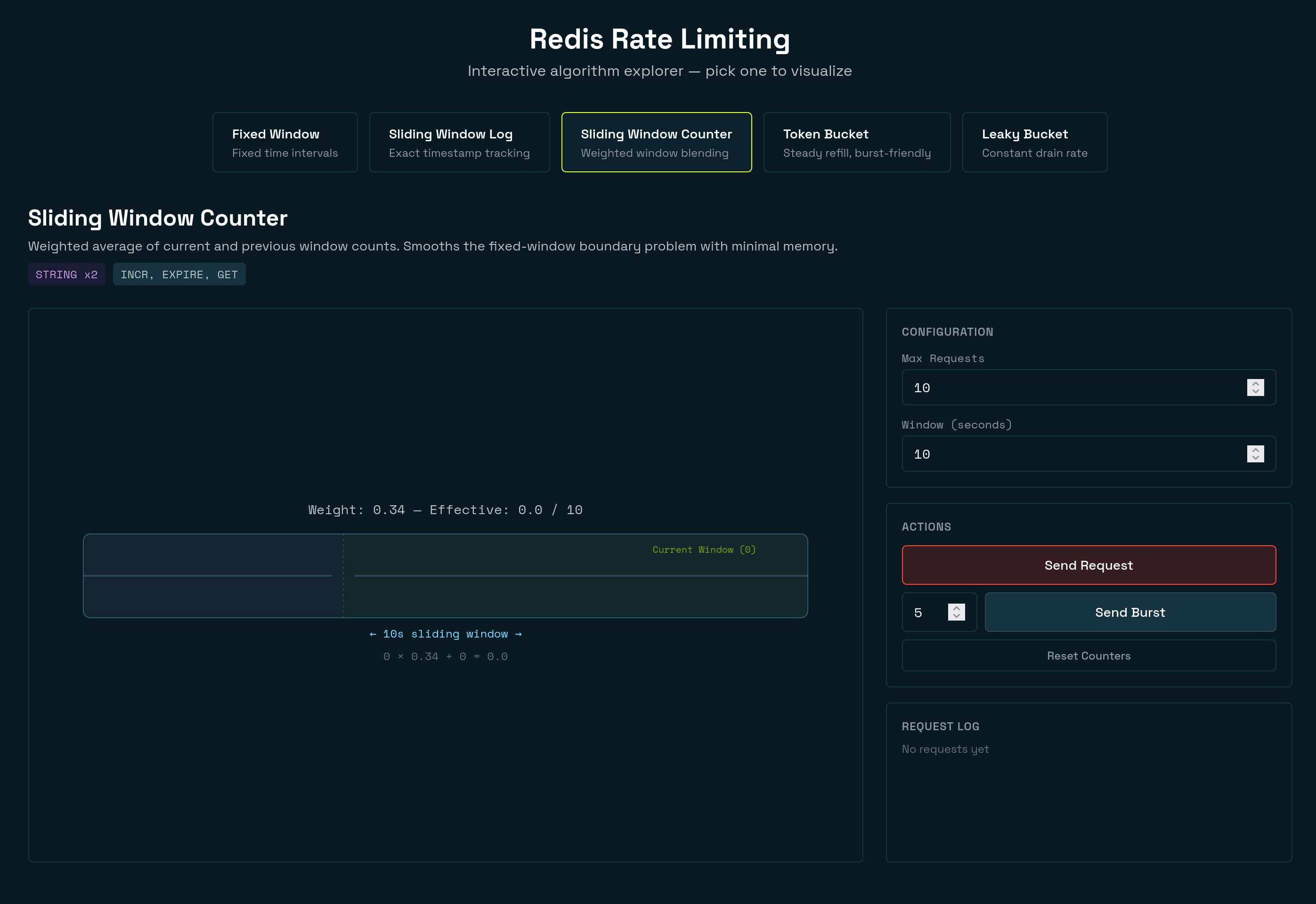 • Burst 10 β€” sends 10 rapid requests in sequence. This is the fastest way to see an algorithm hit its limit.