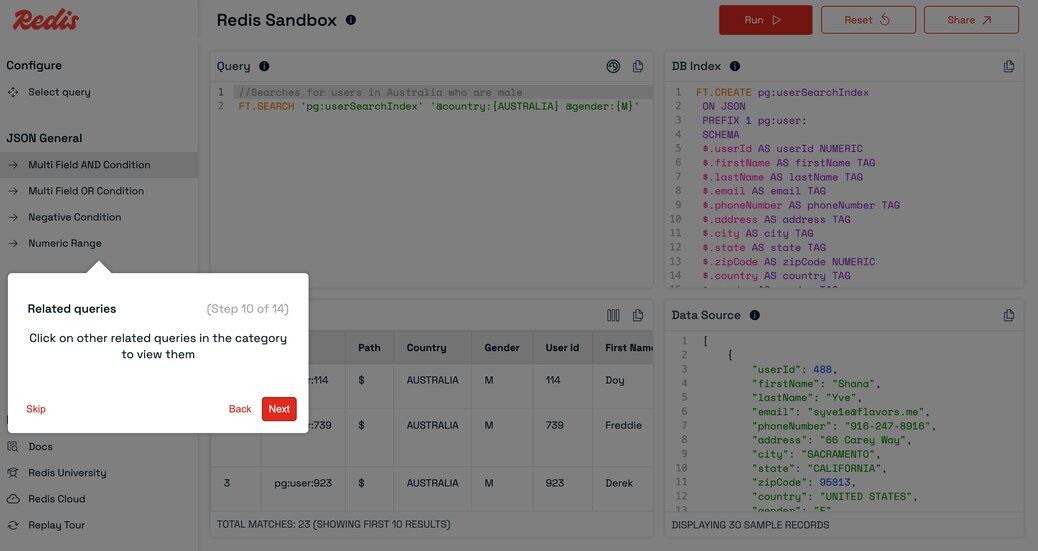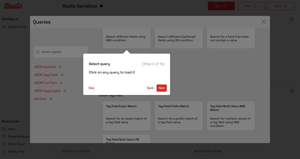 - Browse predefined queries covering common Redis operations and data types