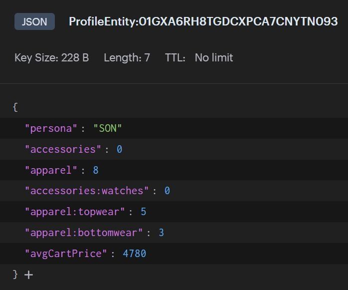 These filters are pre-populated in the demo application based on a feature store. Redis is also storing the features, which in this case is the profiles of each of the personas. Below is an example of one of the profile features: