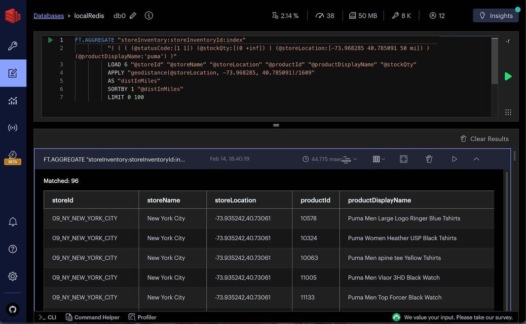 Once the data is indexed, you can execute raw Redis queries to perform Geo Location searches and other spatial operations. Here are two sample queries to demonstrate the capabilities: